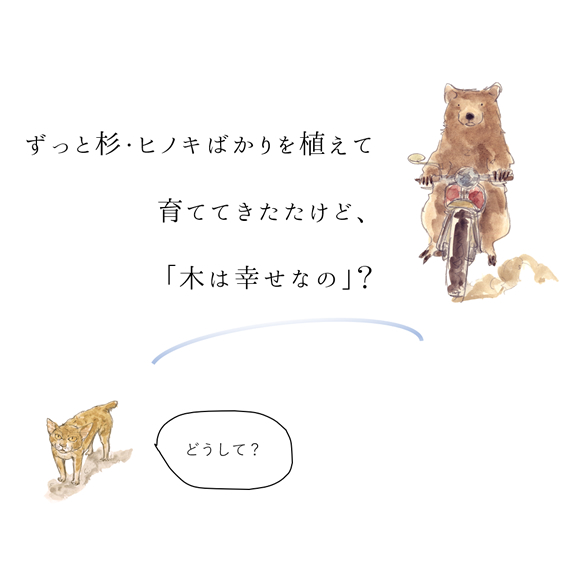 「木のシアワセ視点」で考えたら、樹種の多様性、関わる人の多様性がテーマの新林業となりました。