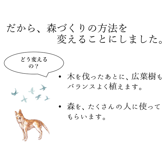 木は、どうあれば幸せなんだろう? いま、木の置かれている環境は70年前とは違う。木が幸せだと、人間もきっと幸せ。だから、森づくりの方法を変えることにしました。基本の考え方は、たった2つ。「木のシアワセ視点」に立って考えること、植える木も、関わるヒトも多様であること。そして始まったテストフィールドづくり。テストフィールドでただいま検証中です。