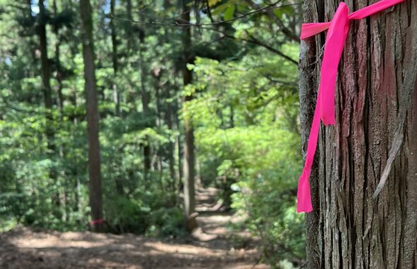 第二エリア。間伐する杉に印をつけました。