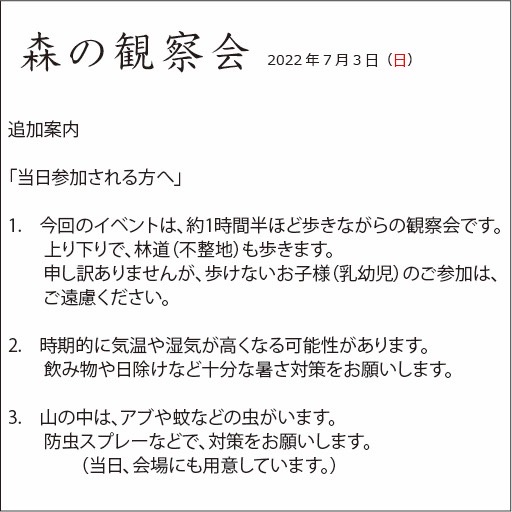 2022.06.25 森の観察会(7月4日)へ参加される方へのご案内 Post Share LINE RSS feedly note 自然環境モニタリング事業を開始します。 7月3日の観察会は雨予報のため中止いたします